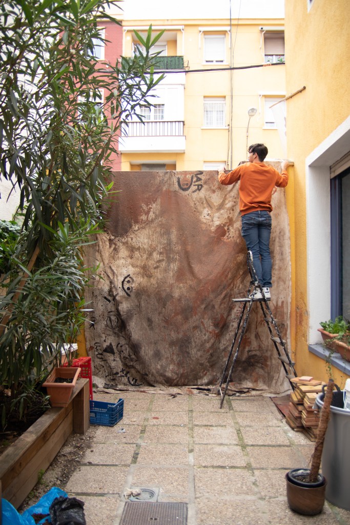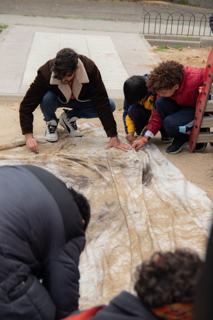 El Viaje: Recorrimos las calles y lugares cercanos al Colegio Cenit y al CAR, llevando una tela de grandes dimensiones. Buscamos el color de los suelos en cada rincón: calles, parques, jardines vecinales, alcorques de árboles y descampados. Frotamos la tela contra la tierra, la mojamos en fuentes y más, extrayendo así el paisaje que nos rodea.